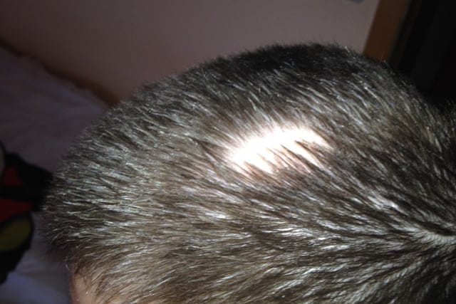 In the case of alopecia areata, distinct bald patches develop over time.